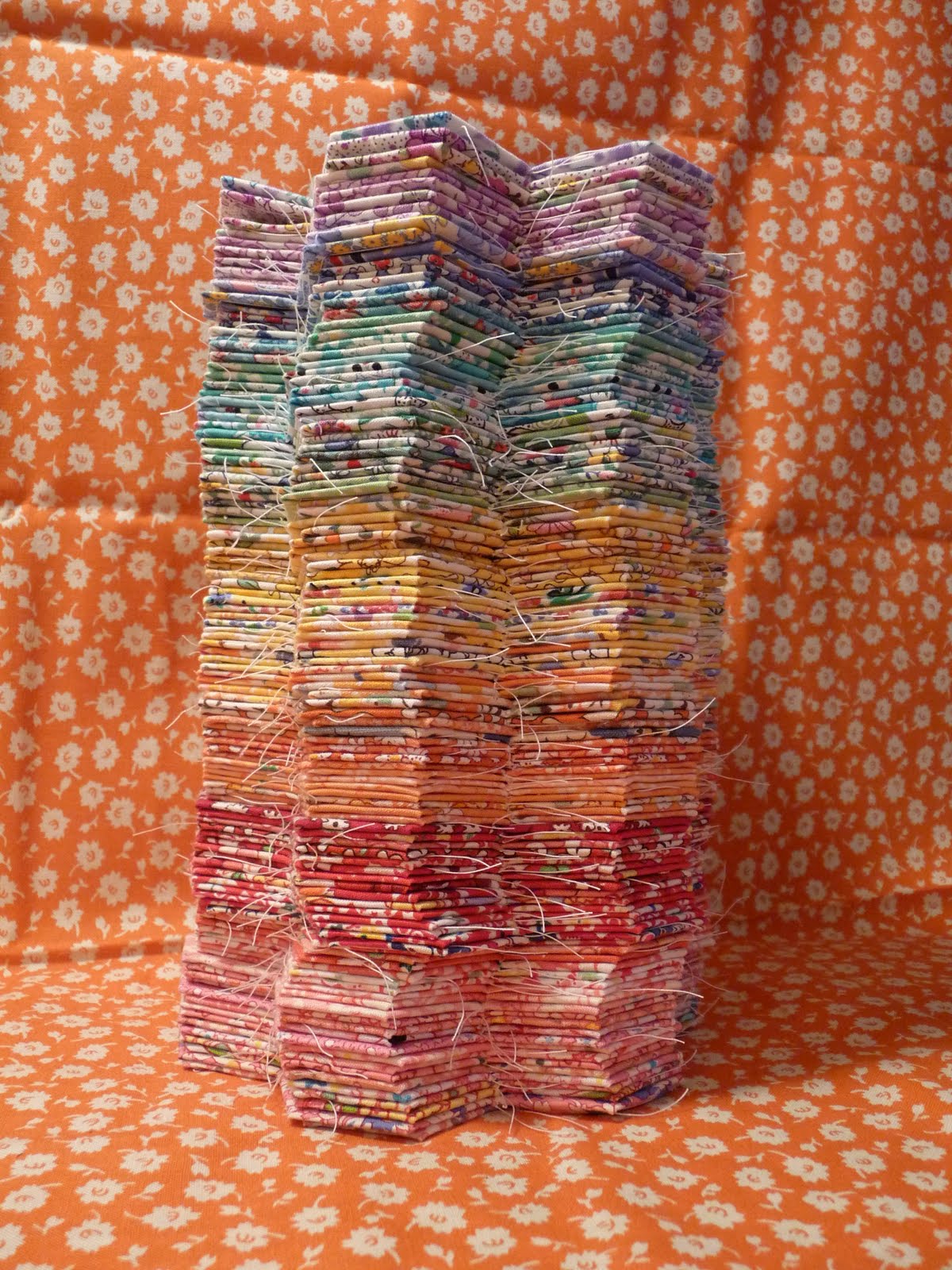 I love your orange fabric..so shiney...and what a beautiful tower of hexies youve got!!..;0))